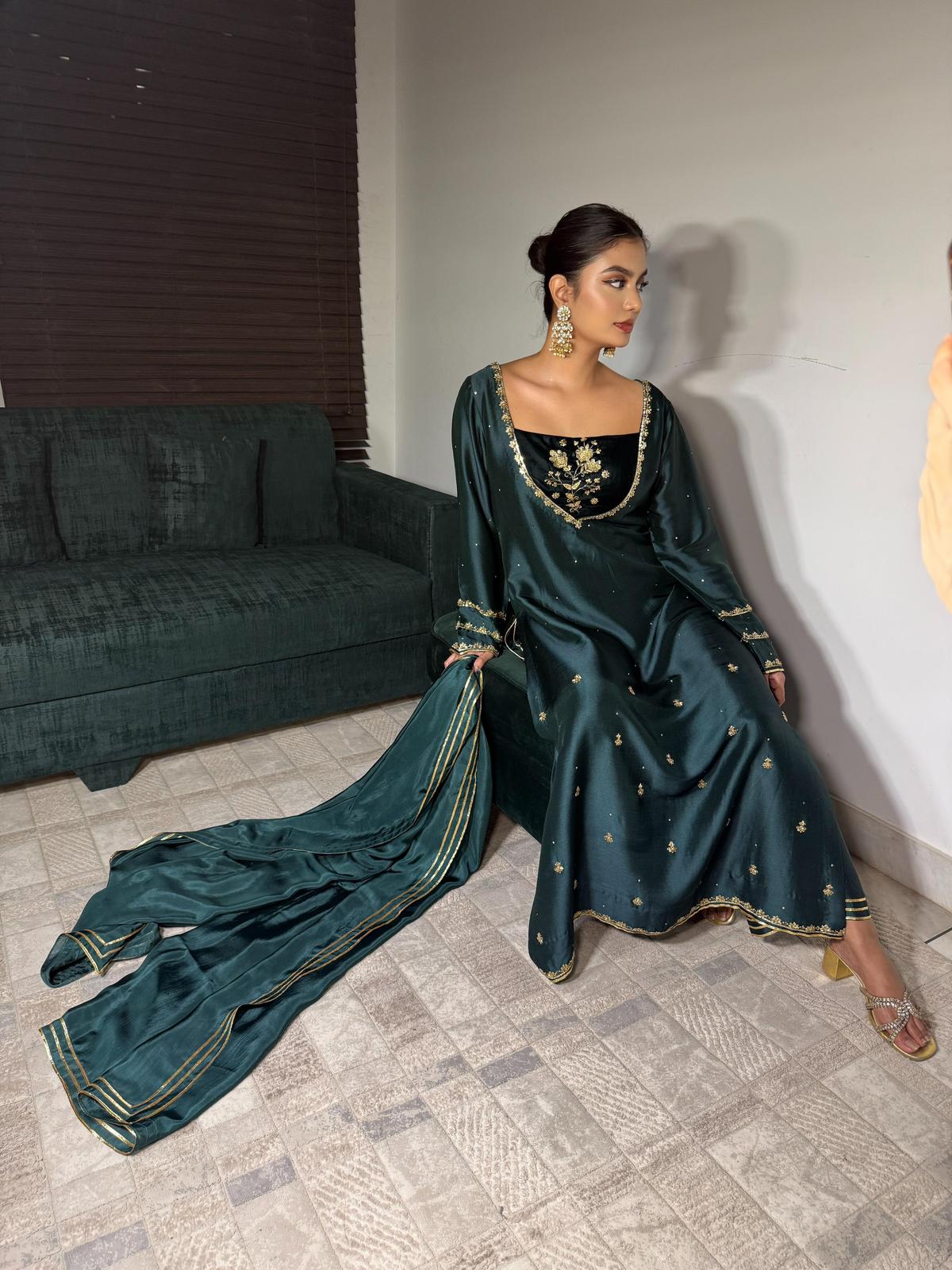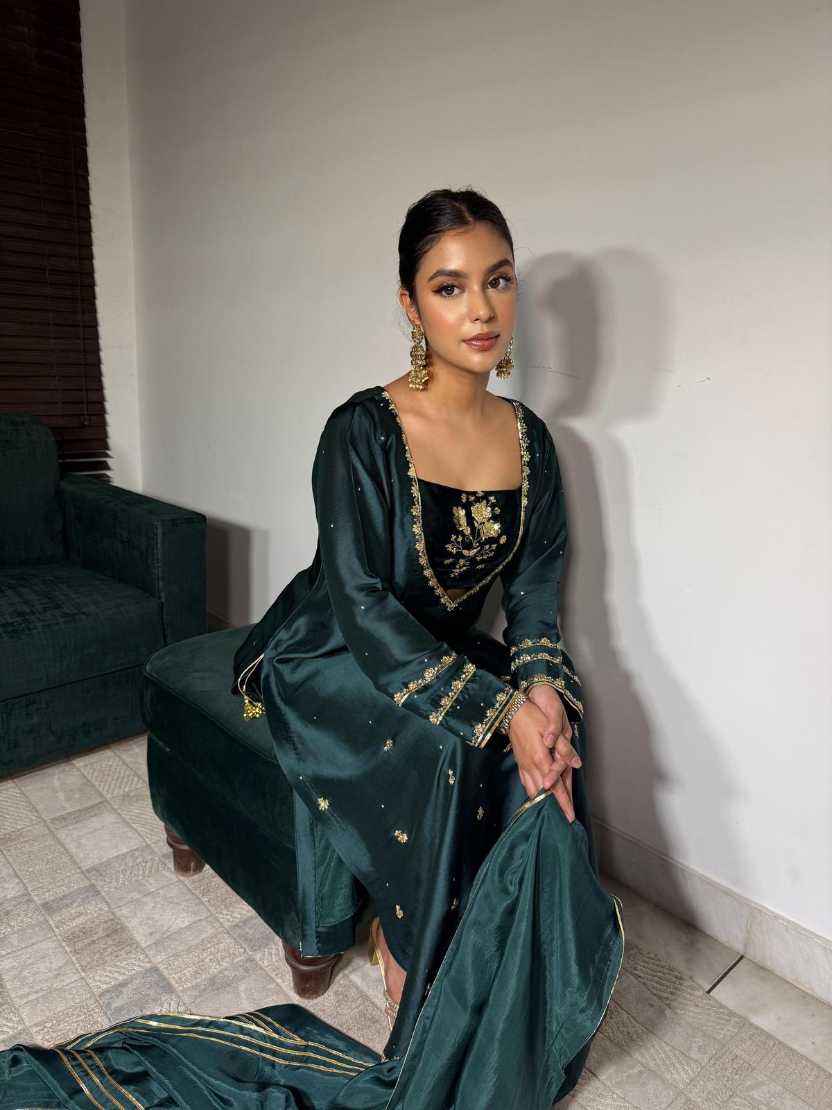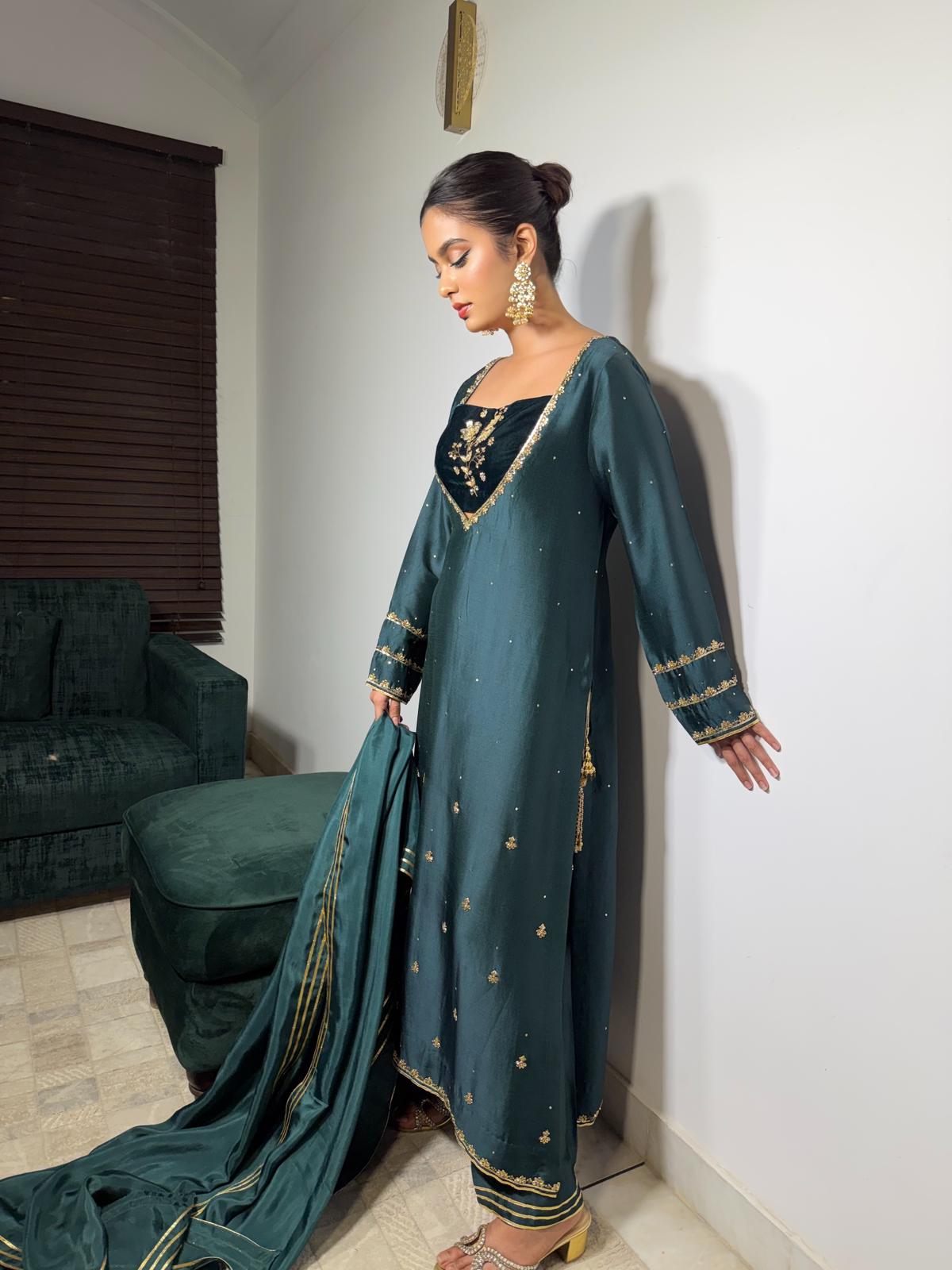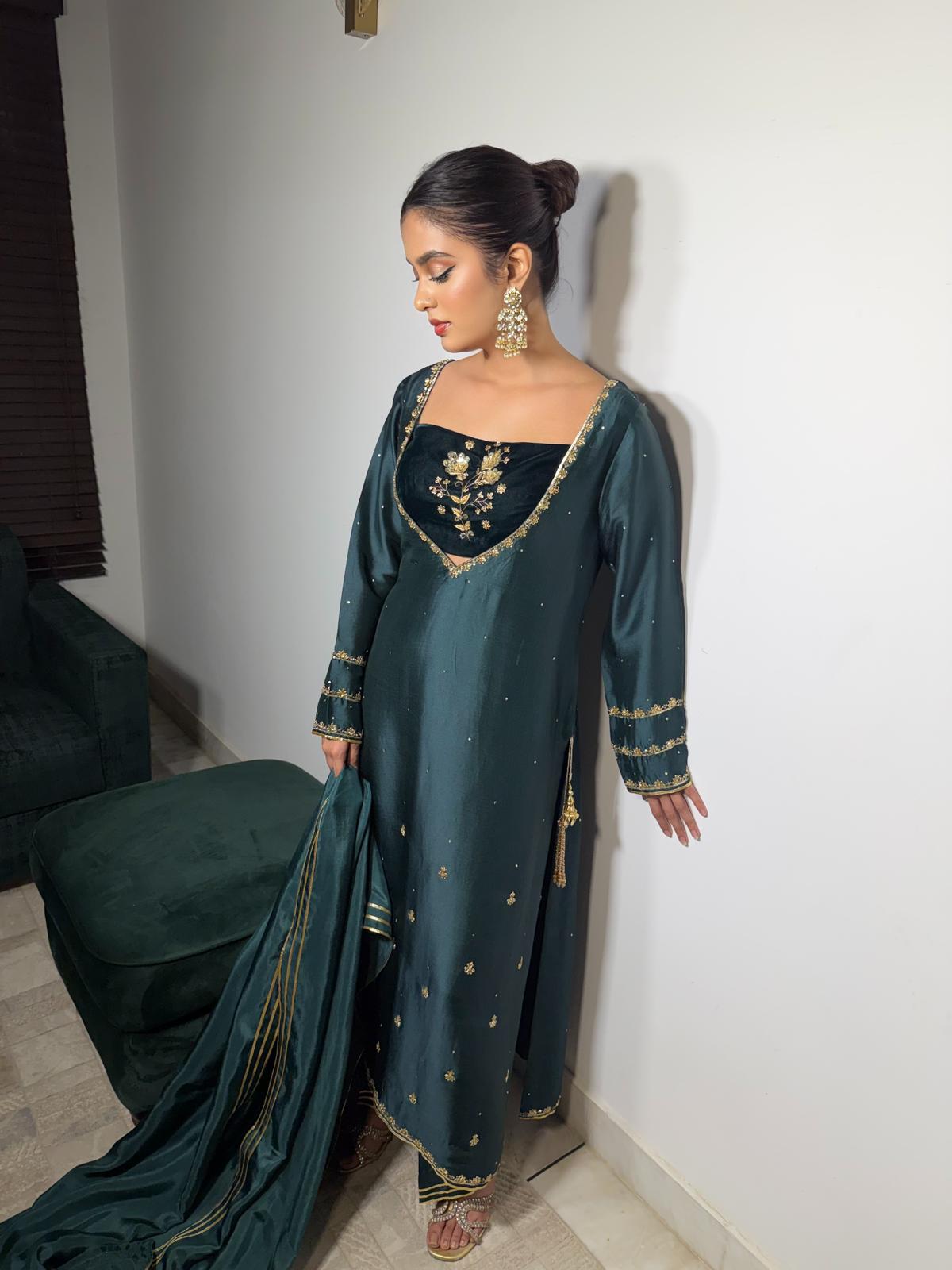 The emerald green pure Sheesha silk shirt is beautifully complemented by a luxurious velvet inner. The outfit is adorned with fully hand-worked sleeves, daaman, and neckline, with intricate detailing extending to the inner layer. Delicate tassels on the chaak add a playful touch, ensuring the outfit shines through.