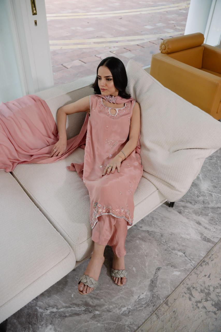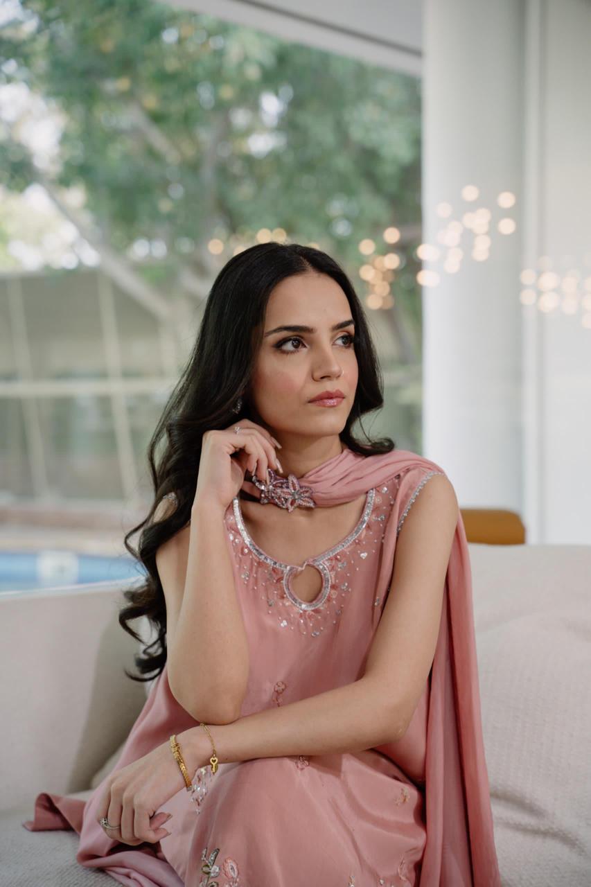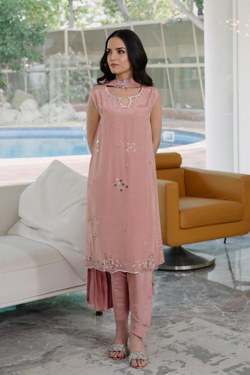 This short-length kameez is crafted from pure Russian silk, offering a luxurious feel and refined finish. The design features intricately hand worked borders and subtle detailing along the neckline, embellished with carefully selected elements to add a personal, artisanal touch. Paired with a classic skinny shalwar and embellished dupatta around the neck, this design exudes traditional elegance and contemporary style.