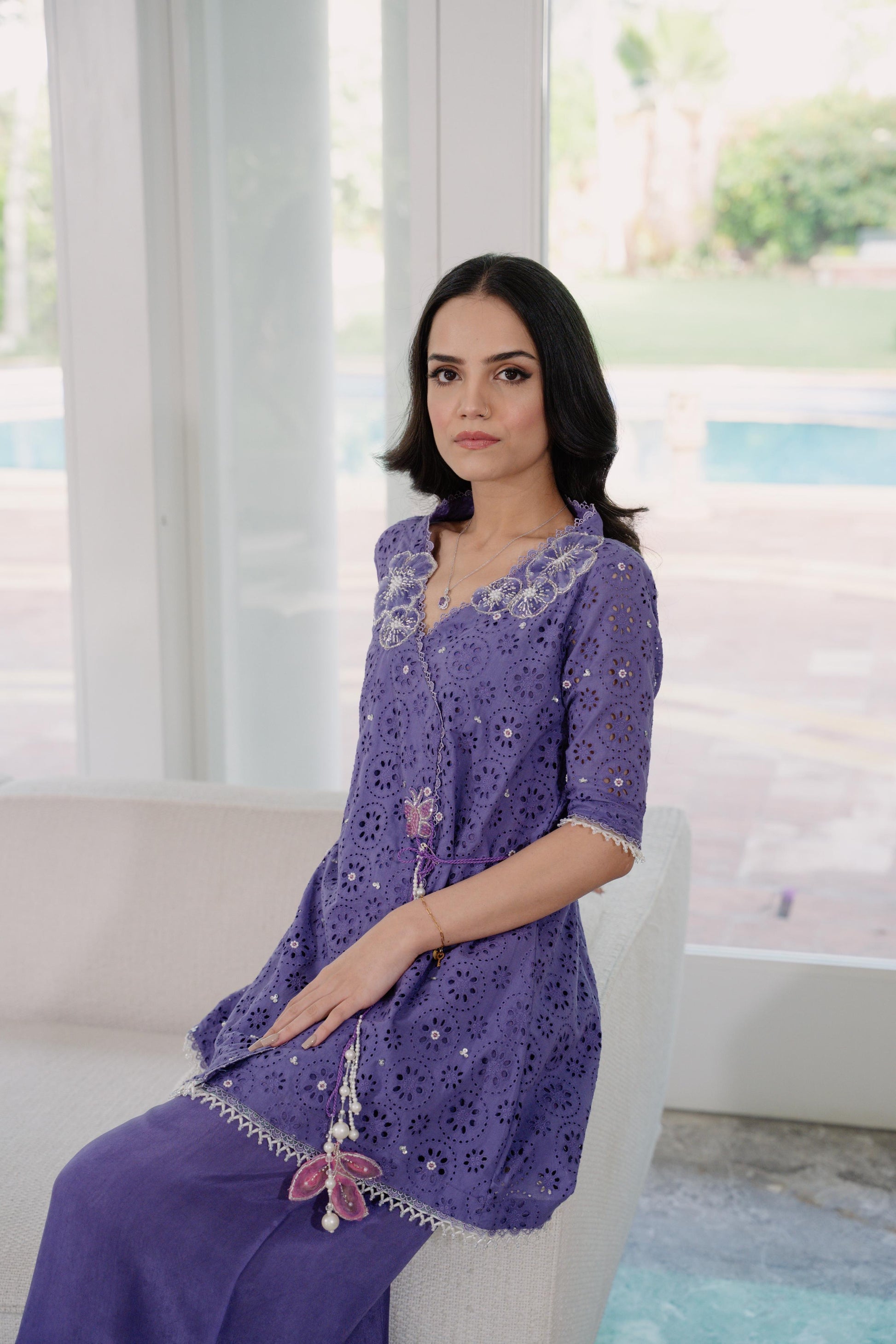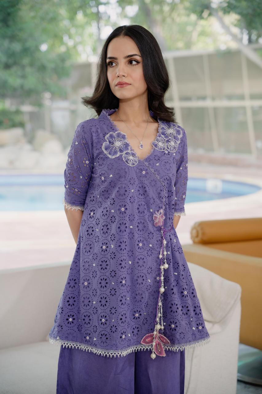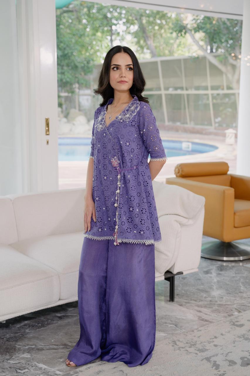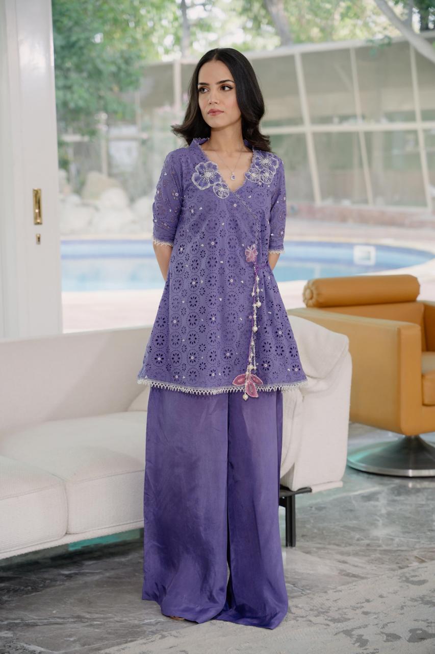 This short angarkha is crafted from pure Chikan fabric, offering a soft, textured elegance. The silhouette is enhanced with delicate hand-embroidered floral motifs, pearl embellishments, and handcrafted dori detailing, adding richness to the design. Paired with wide-leg Russian Silk palazzos, the ensemble achieves a balanced, flowing look that adds depth and dimension to the traditional angarkha.